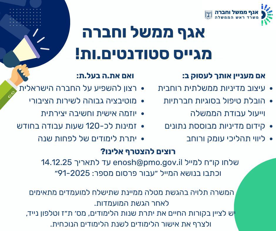 הזדמנות ייחודית עבור סטודנטים לקחת חלק בעיצוב מדיניות חברתית וייעול עבודת הממשלה, תוך צבירת ניסיון והובלת תהליכי ממשלה.